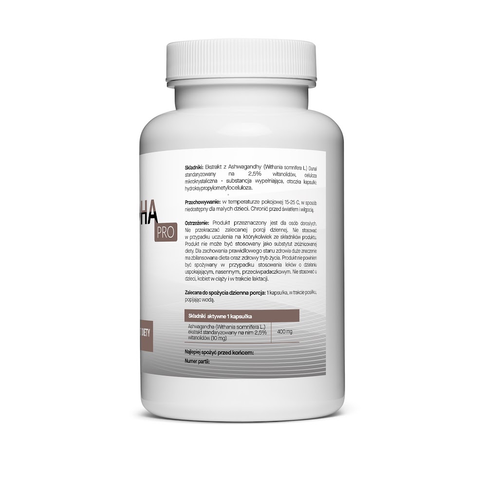 Wspieramy produkty polskiej produkcji przyczyniając się do rozwoju gospodarki.Regularne stosowanie Ashwagandha PRO jest szczególnie polecane osobom poddanym przewlekłemu stresowi, intensywnym treningom lub długim godzinom pracy przy komputerze. Jedna kapsułka z posiłkiem to wygodne rozwiązanie, które nie powoduje pobudzenia jak kofeina, lecz subtelnie podnosi energię i koncentrację przez cały dzień.